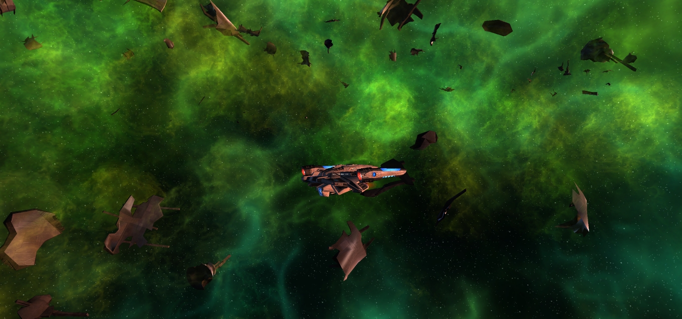The green looks spot on. Very good. I think Cryptic's idea was that the debris was from the Scimitar itself and that the explosion - as it was in the midst of the ship activating its thelaron weapon - altered the whole region from its original state. Makes sense to me, but I would say the option of whether to use that interpretation is entirely up to you